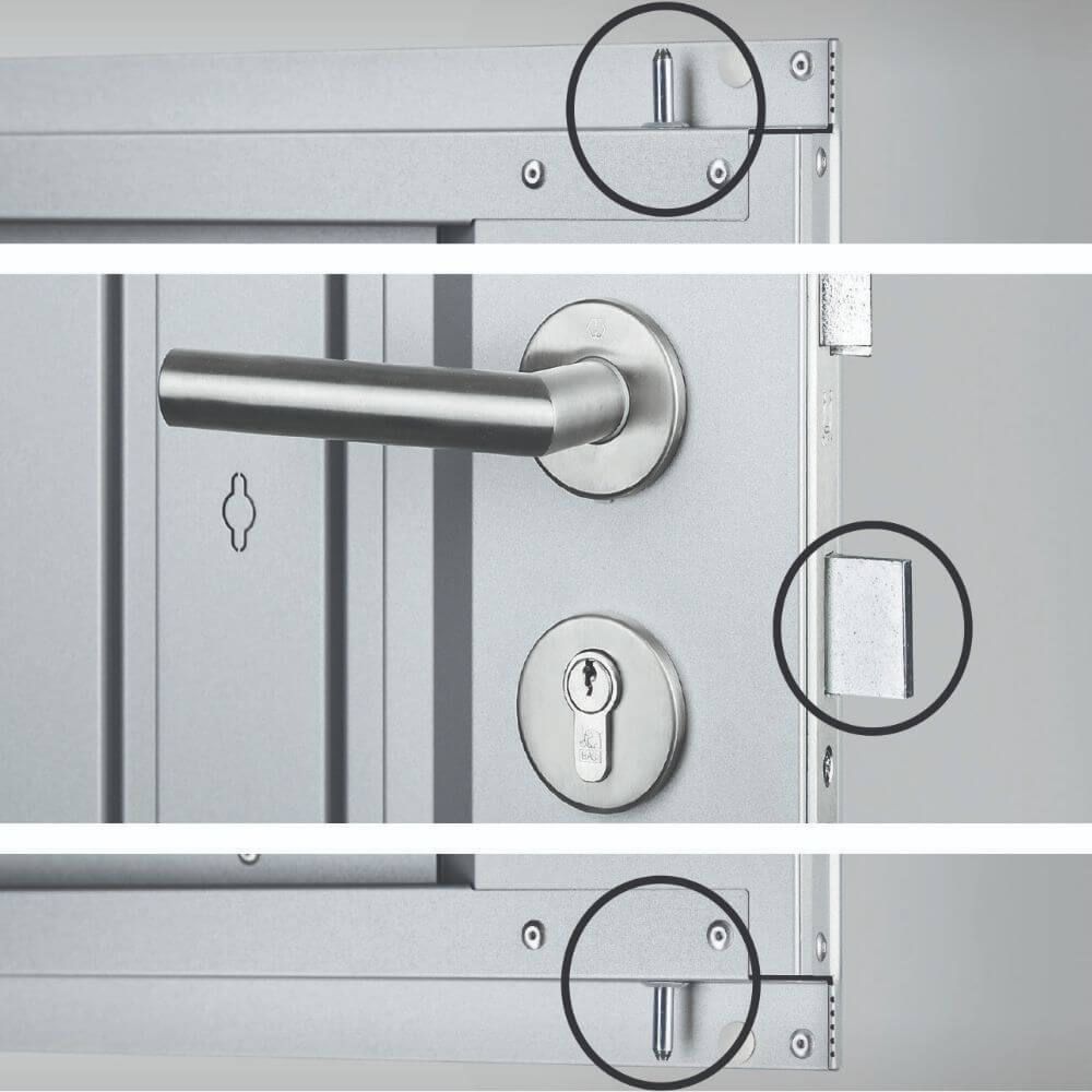 - 3 pontos zár nemesacél kilincsgarnitúrával / 2 ponton záródó középen forgófogantyús cilinderzár az ECO változatnál
