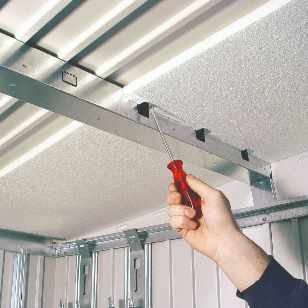 Egyenetlen talaj (pl. gyep) esetén alapozás nélkül is kellő stabilitást nyújt a szerszámos háznak. A vele szállított talajcsavarok biztosítják a viharállóságot.
