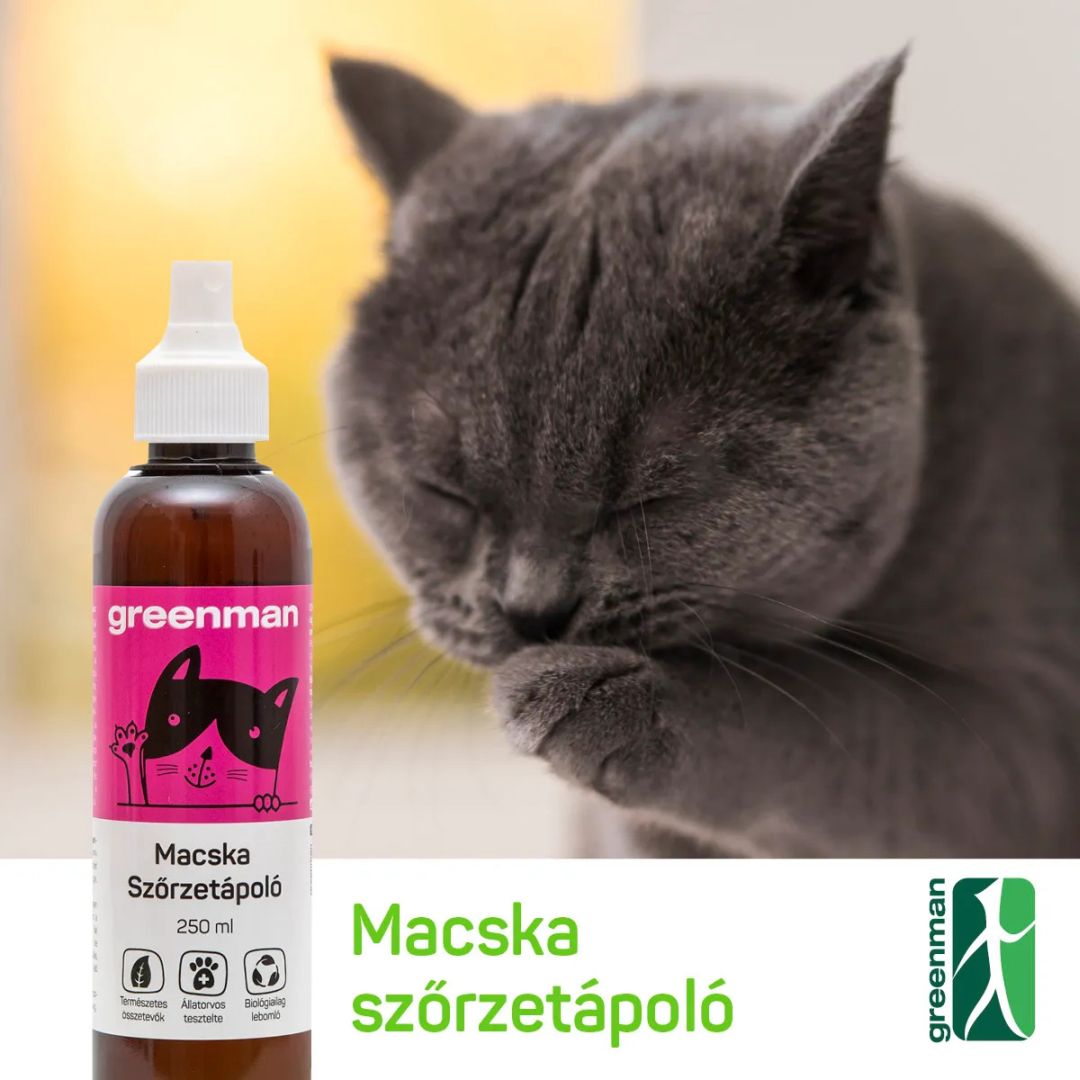 • A cicák többnyire ijedősek, ezért érdemes a Greenman Macska Szőrzetápolót először tenyérbe fújni, majd tenyérrel a szőrzetbe dörzsölni és nem közvetlenül rájuk fújni. Lehetőleg ne engedjük a jótékony baktériumokat tartalmazó készítmény lenyalogatását, bár semmi problémát nem okoz, ha a cica lenyalja, de megfelelő hatás érdekében jobb, ha nem nyalja le. A készítmény természetes összetevőkből álló, nem toxikus, biológiailag lebomló külsőleges oldat.