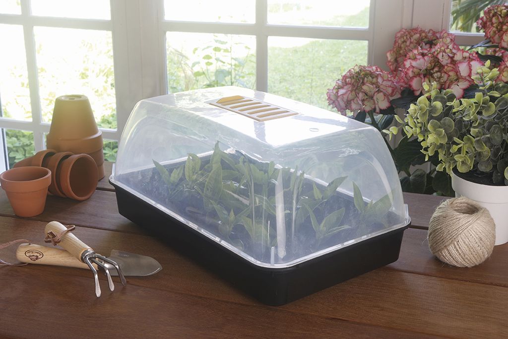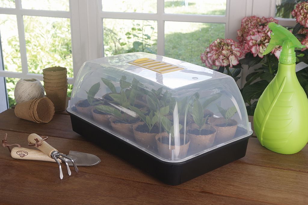 - Egy tucatnyi palántázó edényt is bele lehet tenni az üvegházba, amelynek a fedelén egy központi szellőző nyílás is van.